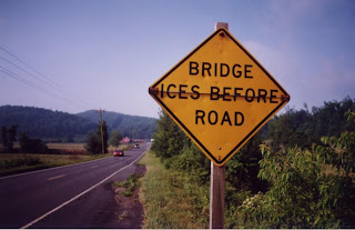 “Bridge Ices before Road” is solid empiricism, and some states also make these signs for seasonal display. Note how this one folds. On the other hand, that approach makes more sense if the sign says “Watch for Ice on Bridge” than it does for this sign. Even in July, the bridge would ice before the road, so folding the sign wastes tax money (what does it cost to pay someone to drive all around and fold signs? Especially signs that are still true even when you can’t read them?). “Watch for Ice on Bridge” is just better. It seems to promise a spectacle where Elvis Stojko may appear. Elvis sightings help tourism. As a professional Highway Ontologist, I endorse it.