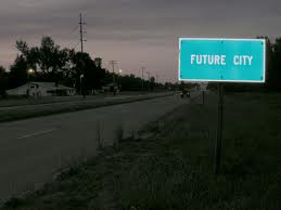 But by the law of association, I considered other places and other signs that led me to similar ponderings. Most closely related is the sign marking several acres of empty lots just north of Cairo, Illinois, a place appropriately named “Future City.” All we have to do is wait, right? But when the city descends from the sky, or erupts from the ground, will it not, then, need a new name? Present City?